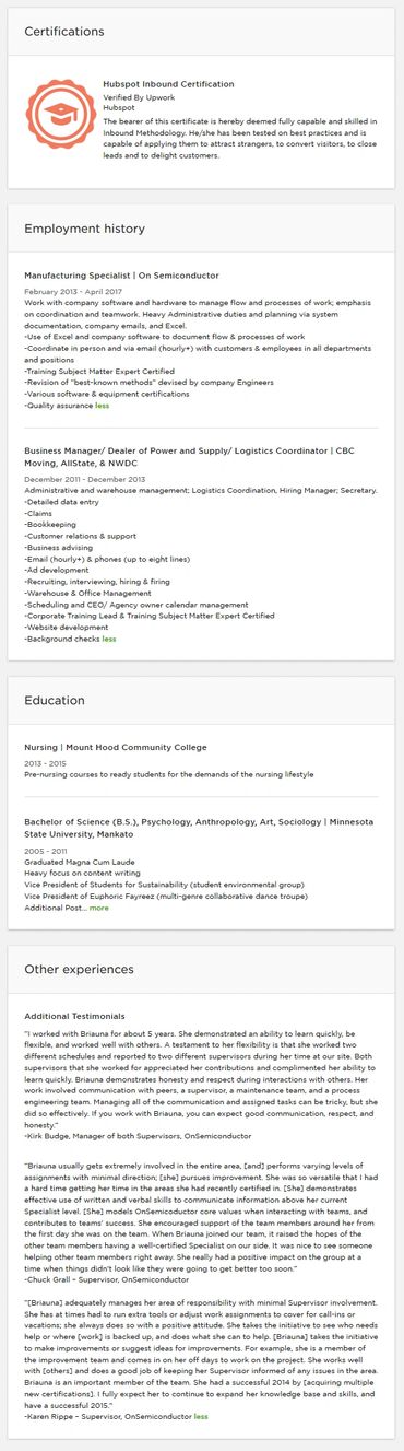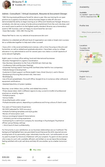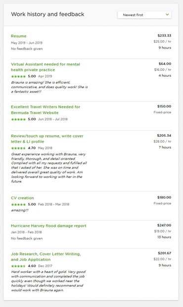 More "social proof!" This time, we are presenting it in the form of feedback for work completed. You may also showcase any additional testimonials from former clients or employers. Work history may be included if it is consistent with your current focusus.