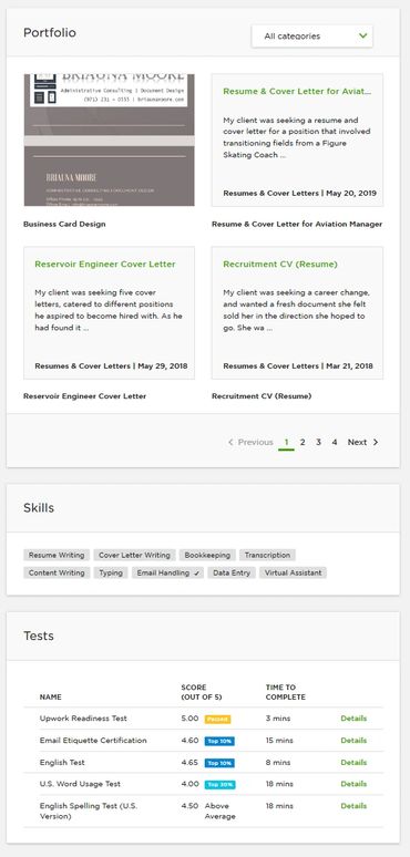 This is an optional section - illustrating skills in clear terms can help clients find you, but if they have already found you, your previous sections should speak. Tests help illustrate competence, but may not be available or up-to-date.
